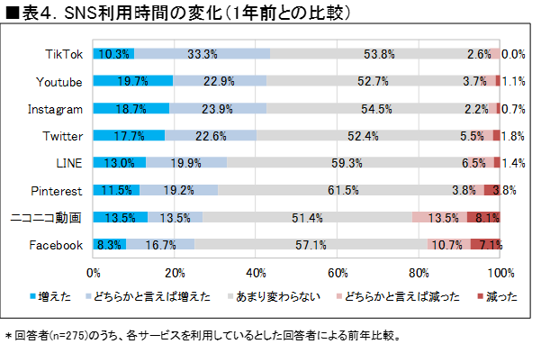 一方で、株式会社ICT総研による「2022年度SNS利用動向に関する調査」によれば、2021年に比べて2022年の利用時間が増えたとユーザーが回答したSNSは、1位がTikTok(43.6%)、2位がYouTube (42.6%)、3位がInstagram(42.6%)でした。